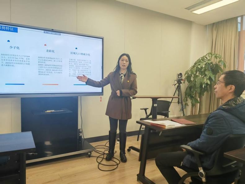 然后,彭丽娟部长以《促进人口高质量发展》为主题,与支部党员同志们交流研讨了“十五五”规划中关于人口高质量发展的重要内容。她深度分析当前人口形势,指出我国现已进入中度老龄化社会,“少子化”“老龄化”“区域人员增减分化趋势明显”是主要特点,未来国家要实现长期均衡的发展目标。另外,彭丽娟部长还和与会人员一起重温了习近平总书记关于“五个坚持”的重要论述,号召大家要立足本职工作,将国家发展和医院建设充分结合。