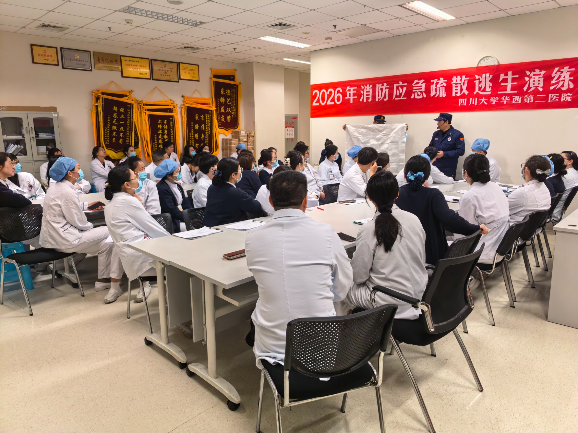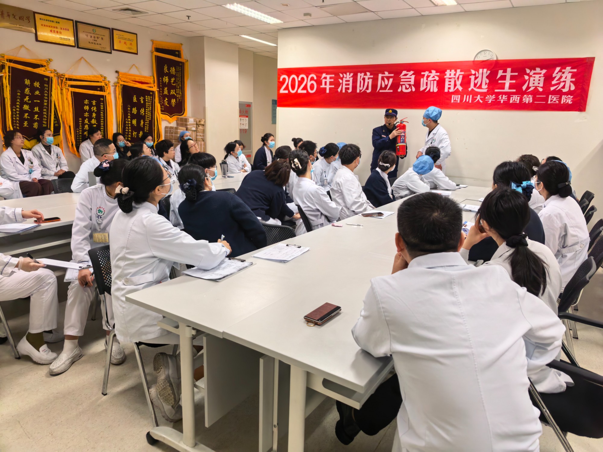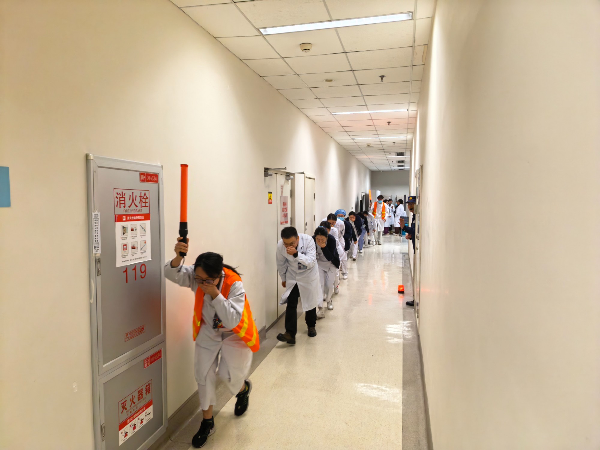 上午9时,演练正式启动。模拟场景设定为锦江院区急诊医学科示教室突发火情,现场迅速弥漫大量烟雾。医护人员第一时间响应,就近取出灭火器赶赴事发区域展开初期扑救,同时另一名医护人员立即拨打医院火警电话,清晰报告火情位置与现场情况;疏散组人员迅速引导在场人员用湿毛巾捂住口鼻,弯腰低姿,避开烟雾区域,沿预定安全路线快速有序撤离。整场演练组织周密、衔接顺畅,各环节配合紧密,应急处置流程规范高效。