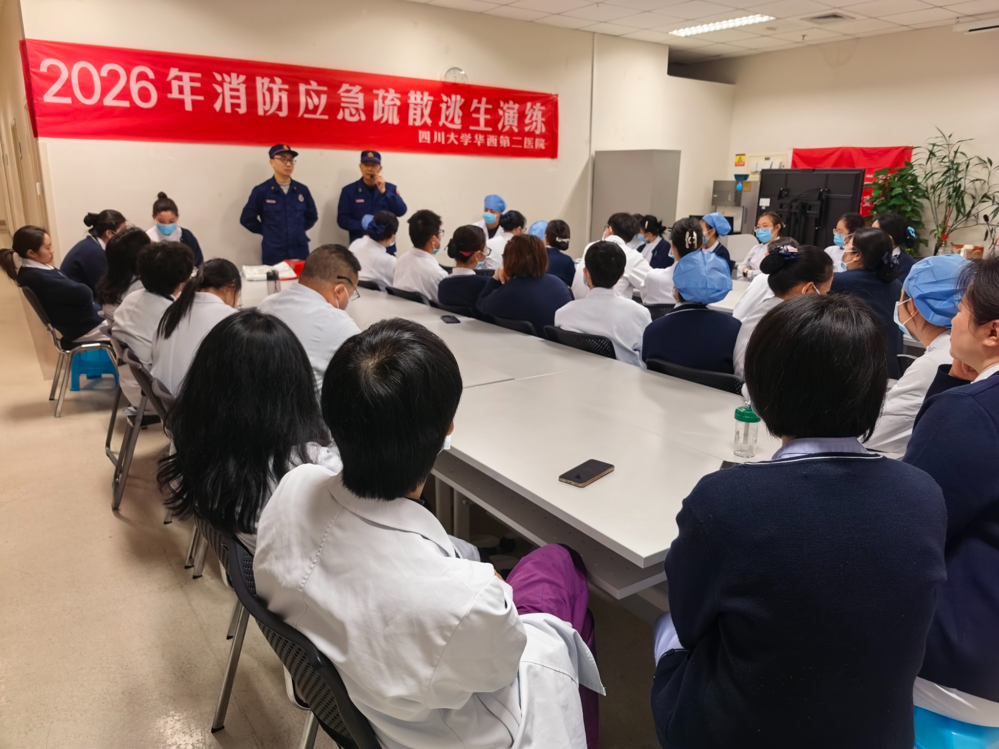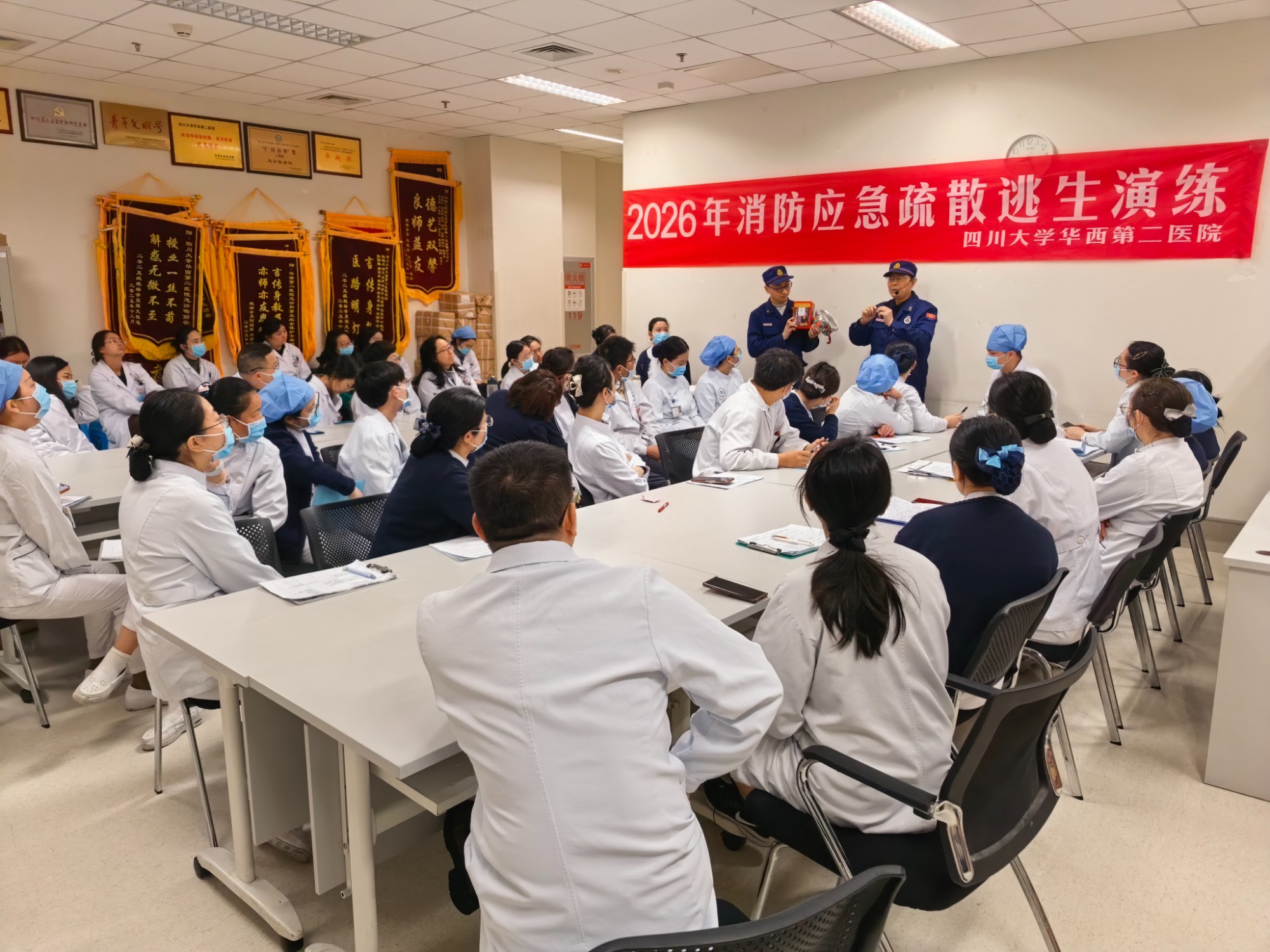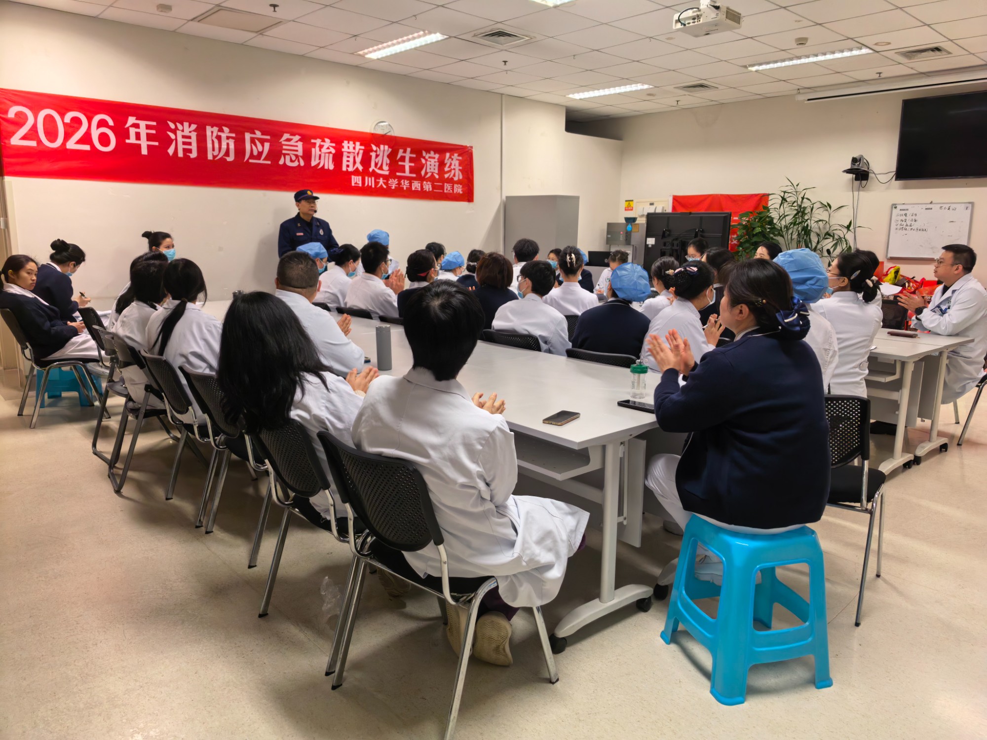 上午9时,演练正式启动。模拟场景设定为锦江院区急诊医学科示教室突发火情,现场迅速弥漫大量烟雾。医护人员第一时间响应,就近取出灭火器赶赴事发区域展开初期扑救,同时另一名医护人员立即拨打医院火警电话,清晰报告火情位置与现场情况;疏散组人员迅速引导在场人员用湿毛巾捂住口鼻,弯腰低姿,避开烟雾区域,沿预定安全路线快速有序撤离。整场演练组织周密、衔接顺畅,各环节配合紧密,应急处置流程规范高效。
