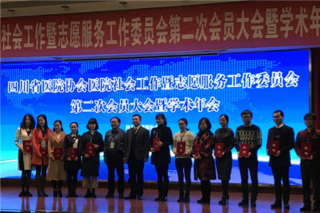 11月26日,四川省医院协会医院社会工作暨志愿服务工作委员会第二次会员大会暨学术年会在成都天使宾馆举行,全省医院社会工作及志愿服务工作者代表参会,我院党委王红静副书记和相关部门负责人共6人参会。开幕式上,我院团委书记陈莉娟因论文《医院志愿者管理工作探讨》获优秀奖接受表彰;与会人员认真聆听了医务社工和医院志愿者工作讲座,本次讲座主题立足于西部地区医务社工和志愿者工作的实务经验总结,让大家受益匪浅,下一步我院将从志愿者信息化和规范化管理方面做好工作。(供稿、摄影:陈莉娟)