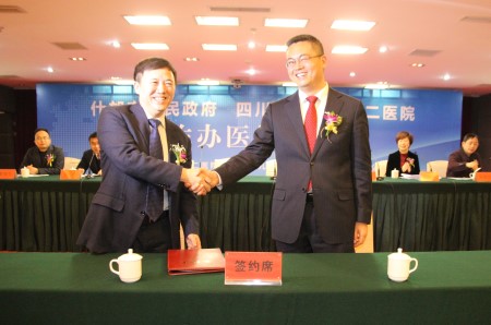 我院张林院长代表四川大学华西第二医院,什邡市委副书记、市长卿伟代表什邡市人民政府,签订签订合作办医协议