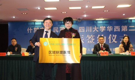 我院张林院长代表四川大学华西第二医院,什邡市妇幼保健院院长桂逢春代表什邡市妇幼保健院,签订区域联盟医院协议,张林院长为什邡市妇幼保健院授牌。