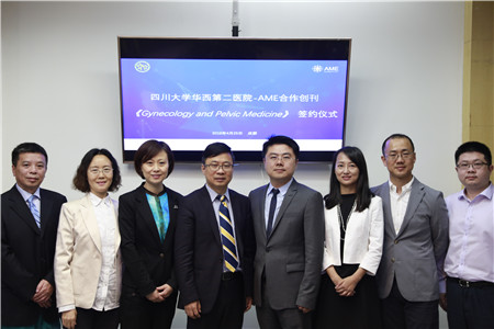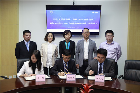 4月25日上午,我院与AME出版社在成都签署战略合作协议,携手共创Gynecology and PelvicMedicine(简称GPM)国际学术期刊。我院院长刘瀚旻、副院长牛晓宇、妇产科主任赵霞、妇科主任王平,AME出版社社长汪道远、副社长方艳、成都办主任李琦等人出席了签约仪式,会议由王平教授主持。