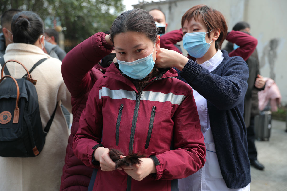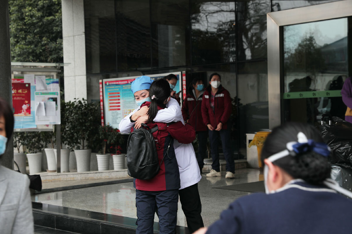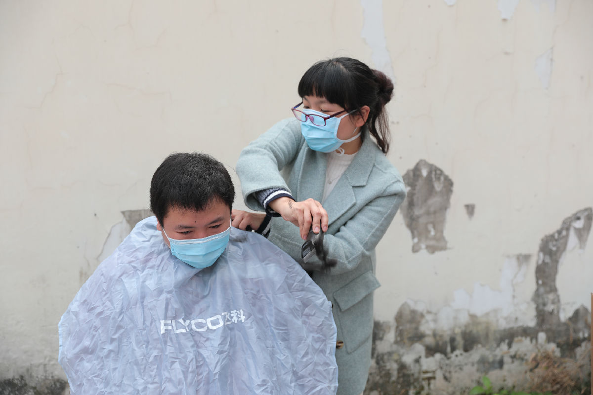 为了避免头发外露沾染病毒,方便穿脱防护衣帽,护士长自带理发工具,为医疗队理发,即使女生齐腰长发被剪下,男士剃成光头,队员们也没有一丝失落,反而觉得这是人生中的“荣光时刻”。中午时分,队员们告别同事和前来送行的家人们,踏上征程,做无畏的逆行者,誓要在这场“战斗”中获得最终胜利。