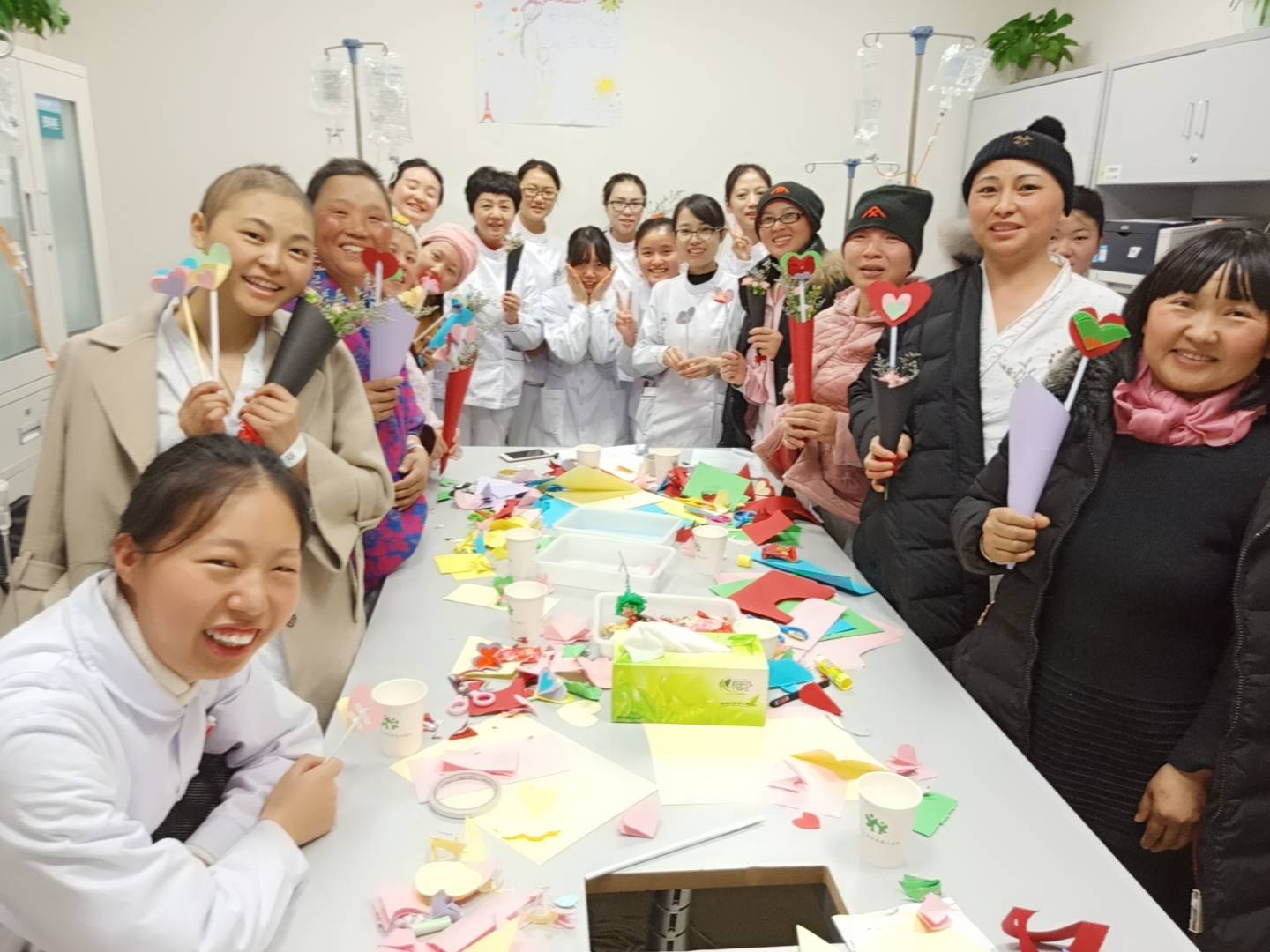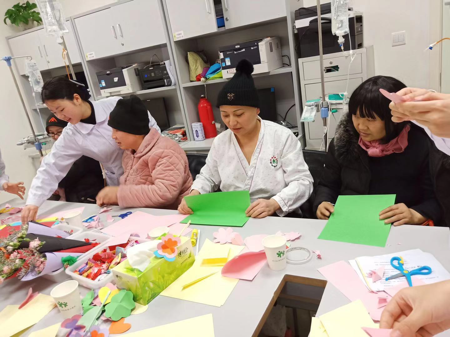 2019年3月8日上午,经过妇科肿瘤放化疗科护士长何亚林、副护士长田亚林前期精心策划,由带教老师杜娟和实习同学陈希如主持,进修护士、实习护生组织8位化疗患者在12楼办公室进行了我科艺术治疗活动——“3.8女王节,“化”身女王”,本期艺术治疗以剪纸制作许愿棒,表达对自己或家人祝福的形式开展。
