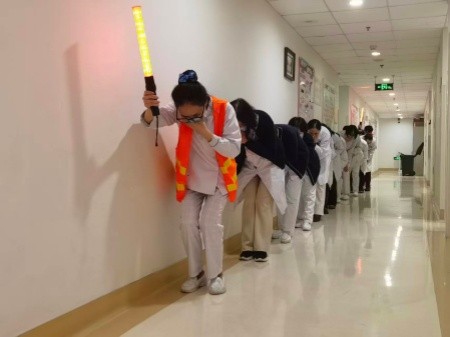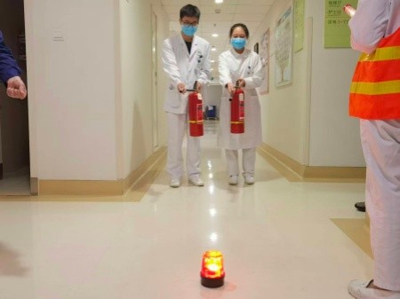 理论培训结束后,一场贴近实战的消防应急演练随即展开。随着“火情警报”响起,肿瘤中心立即启动消防应急预案,各小组迅速响应:疏散引导组有序组织大家弯腰捂鼻,沿安全通道转移;灭火行动组携带灭火器快速抵达“火情现场”,按照规范流程开展初期火灾扑救。整个演练过程紧张有序、配合默契,充分检验了培训成果和科室应急反应能力。