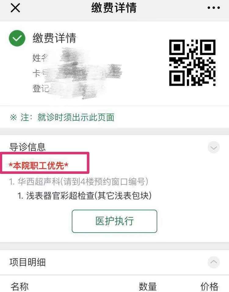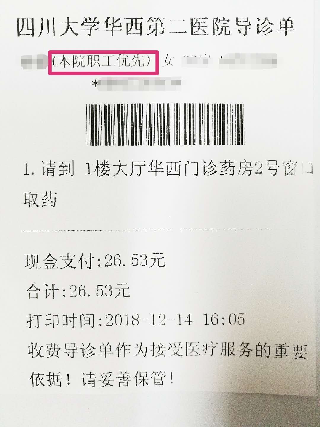 医院为提高职工福利,方便本院职工就诊,于2016年建立“职工就医绿色通道”,职工持“员工就诊单”即可于相应科室享受优先。随着我院锦江院区的运行,职工分布于双院区工作。为进一步方便职工就医,同时响应医院“无纸化”的发展要求,预防保健科联系信息管理部实现了“本院职工就医绿色通道”信息化:职工缴费后,导诊单上即显示“本院职工优先”标示(纸质版、微信版如下图),职工凭导诊单即可在相应科室享受优先。