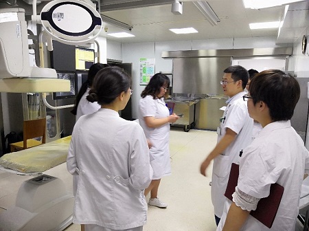 医务部先后查看放射预约室、CT室和介入手术室,重点检查放射防护、知情同意书签署、造影剂医嘱及执行、抢救应急预案、抢救团队构成及抢救物资准备等各项情况。