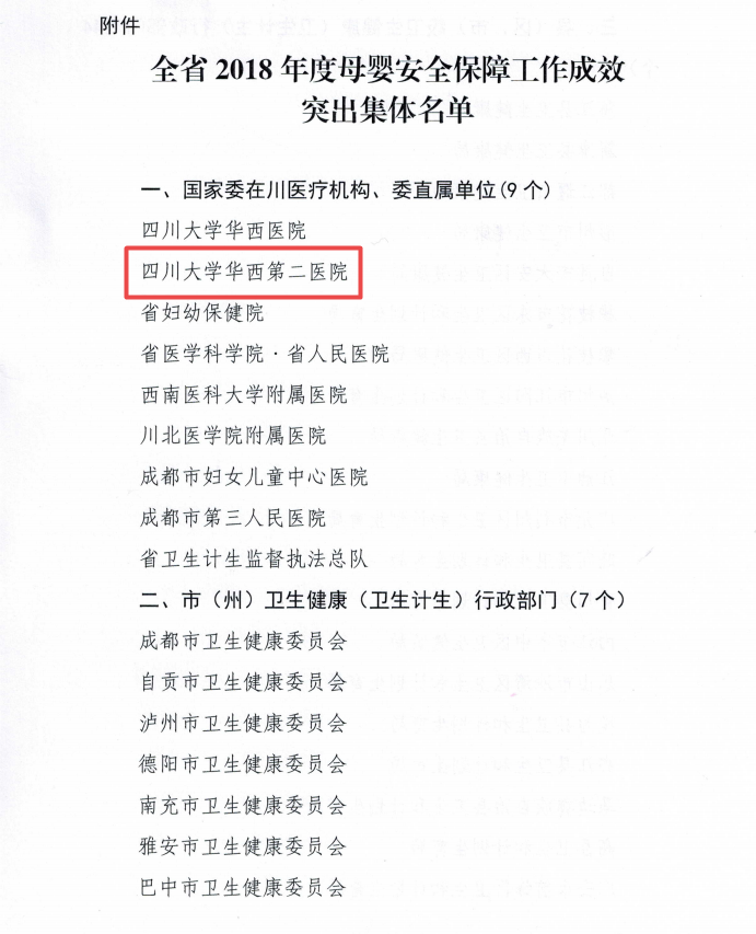 为鼓励先进,激发斗志,持续深入推进母婴安全保障工作,经省卫生健康委研究决定,对2018年贡献突出、成效明显的集体予以通报表扬,其中:我院被评为“2018年度四川省母婴安全保障工作成效突出集体”。