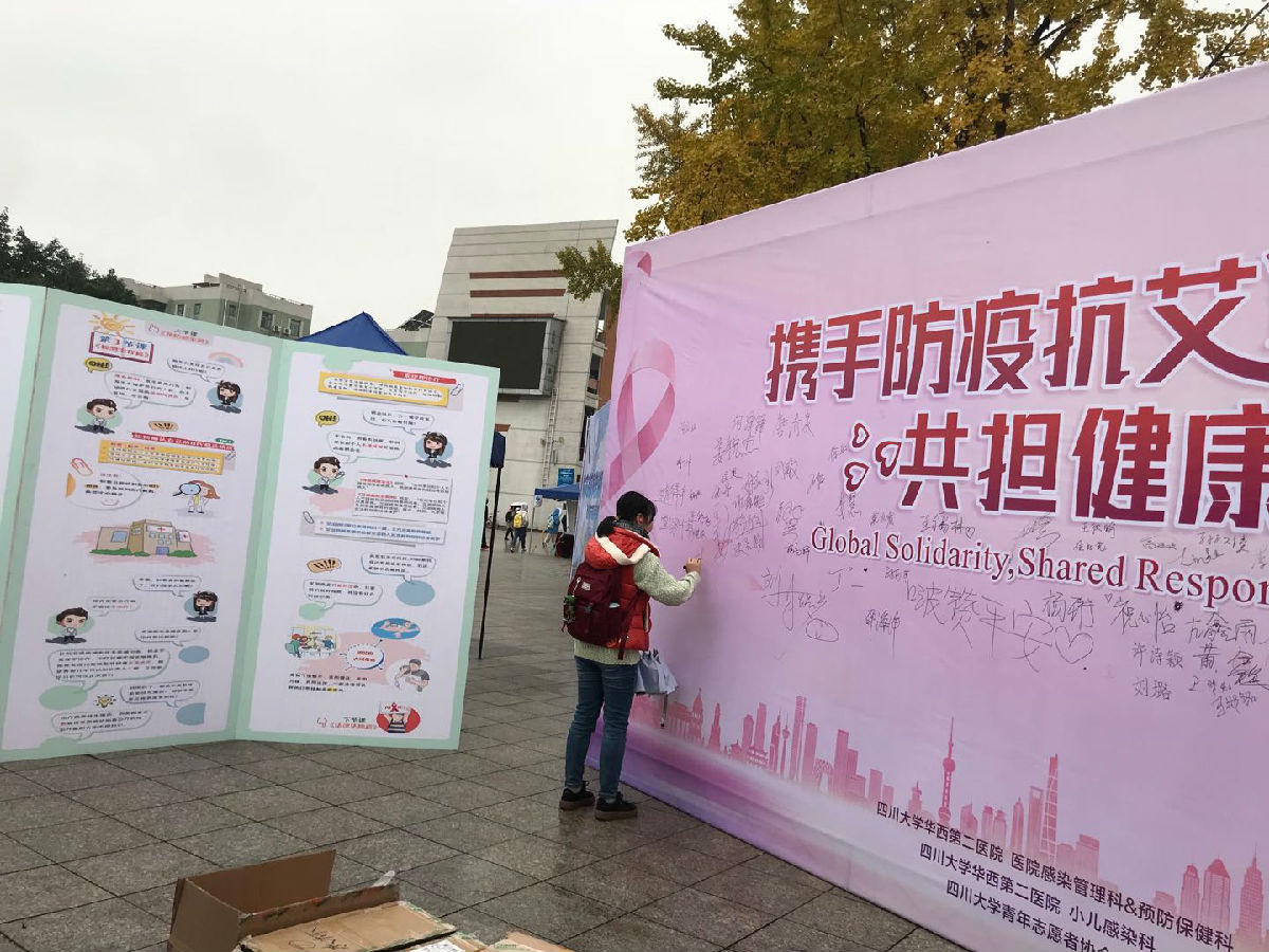 12月1日是第33个世界艾滋病宣传日,为大力普及艾滋病防治知识,进一步提高全社会对艾滋病防治工作的认识,全面推动艾滋病防治工作,深入开展重点人群干预工作,医院感染管理科、预防保健科联合小儿感染科、四川大学青年志愿者协会在四川大学江安校区举办“携手防疫抗艾,共担健康责任”宣传活动。