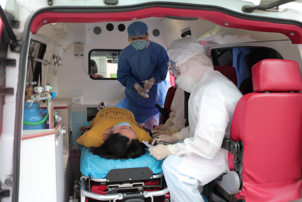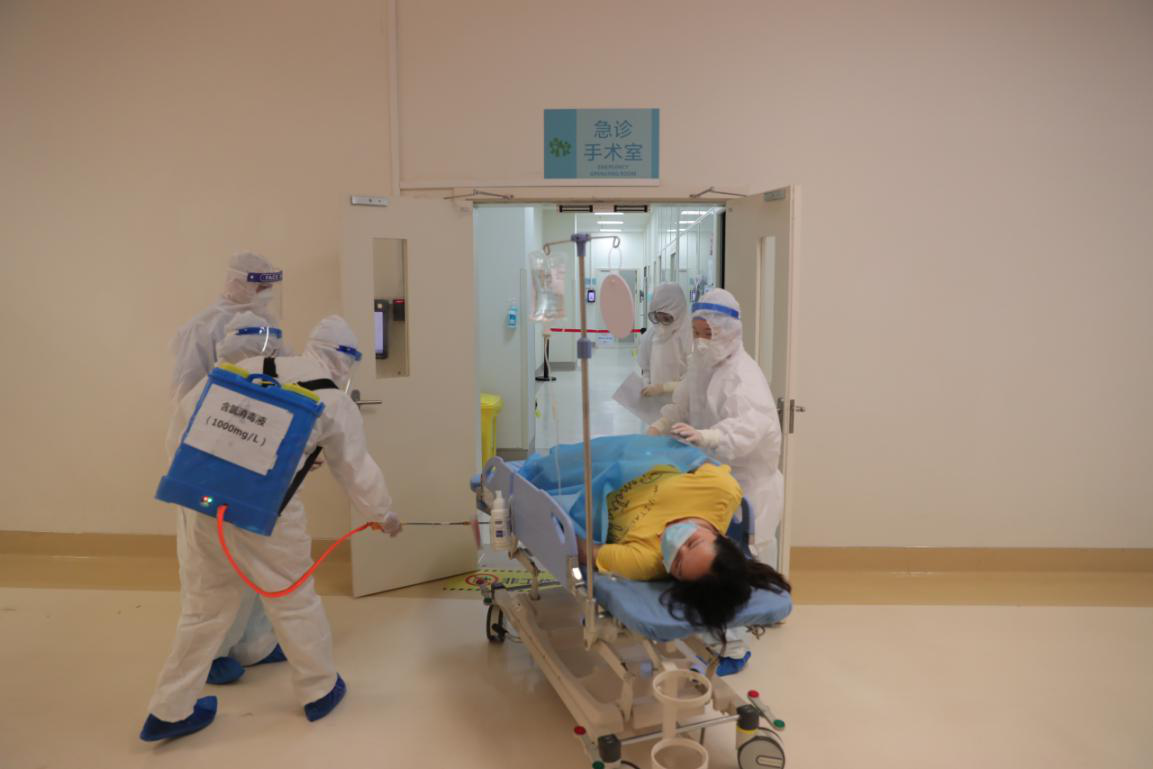 本次演练以一名“三无”疑似新冠病毒感染的孕妇为主线,各部门/科室人员按照既定应急救治方案,充分做好个人防护,有序开展预检分诊、发热门诊接诊、标本采集、疫情报告、专家会诊、急诊剖宫产、新生儿转运、产妇转运、超声/放射检查、环境消毒等全流程实战演练。