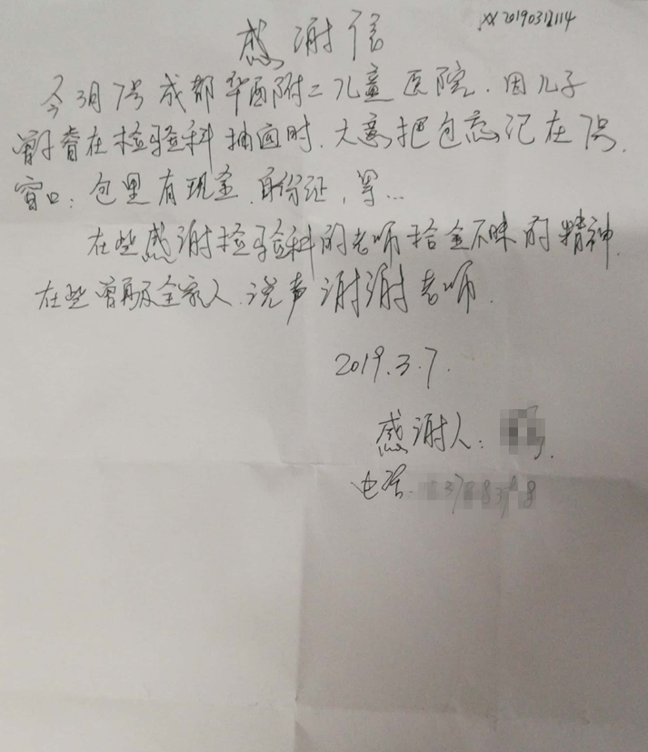 检验科样本处理组虽为科室的窗口部门,但与患者接触的时间相对短暂,所以对于每次来之不易的褒奖,科室都格外珍惜。3月26日,检验科收到了一封特殊的感谢信,与感谢科室服务态度良好、检验技术绝佳不同,这封信感谢的是科室老师拾金不昧、医德高尚的精神面貌。