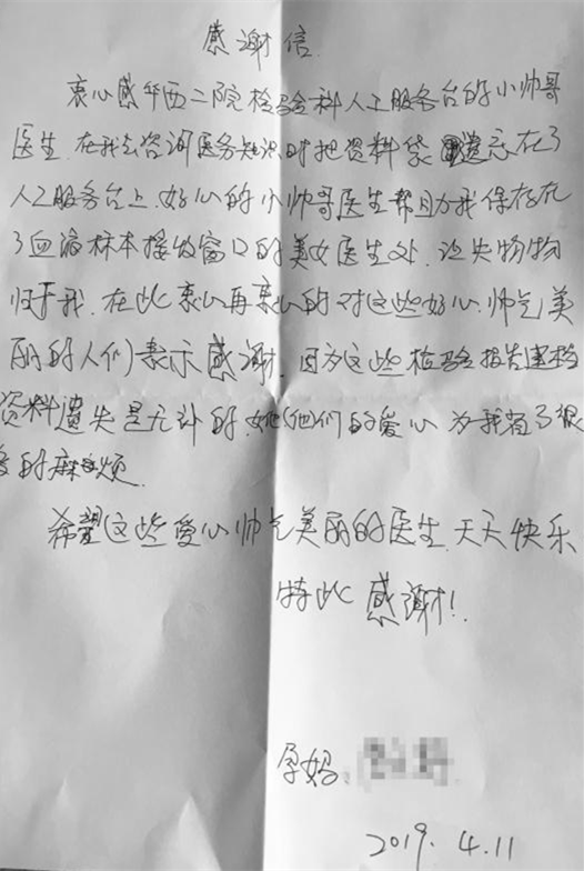 近日,一名患者来到我院就医,在检验科人工服务台咨询时,不慎将产检病历资料袋遗落。科室老师发现后,立即与患者取得联系,并将其文件资料保存在标本接收窗口。患者取回资料后,对检验科老师的帮助表示衷心感谢。