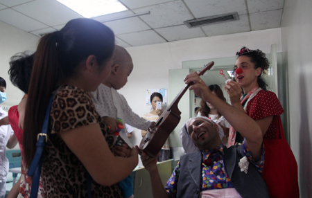 八月七日下午,我院小儿心血管科和血液科的住院患儿在自己病室里,开心地观看了一出颇具互动性的小丑演出。表演的两名小丑 Avital Dvory和Shlomi Golan是以色列著名的的小丑治疗师。他们应以色列领馆的邀请到中国巡回演出,用他们独特而专业的方式给患儿带来欢乐。(供稿:华纪平 陈帆,摄影:华纪平)