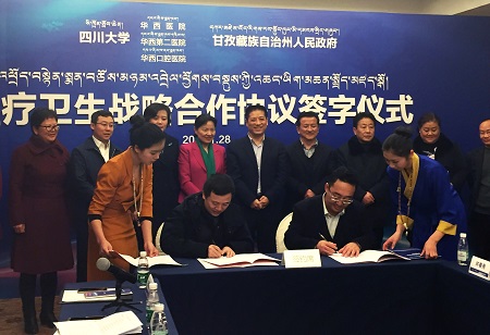 1月28日晚,四川大学华西医学中心三家附属医院与甘孜藏族自治州医疗卫生战略合作协议签署仪式在成都举行。甘孜州委书记刘成鸣,州人大常委主任李康,州委副书记、州长益西达瓦,州政协主席易凡,四川大学党委副书记、华西口腔医学院院长周学东,华西医院院长李为民、党委书记敬静,华西第二医院院长张林、党委书记王素霞等领导出席签约仪式,州发改委、州财政局、州人社局、州卫生计生委、州人民医院及华西三家附属医院相关部门的负责人参加了仪式。