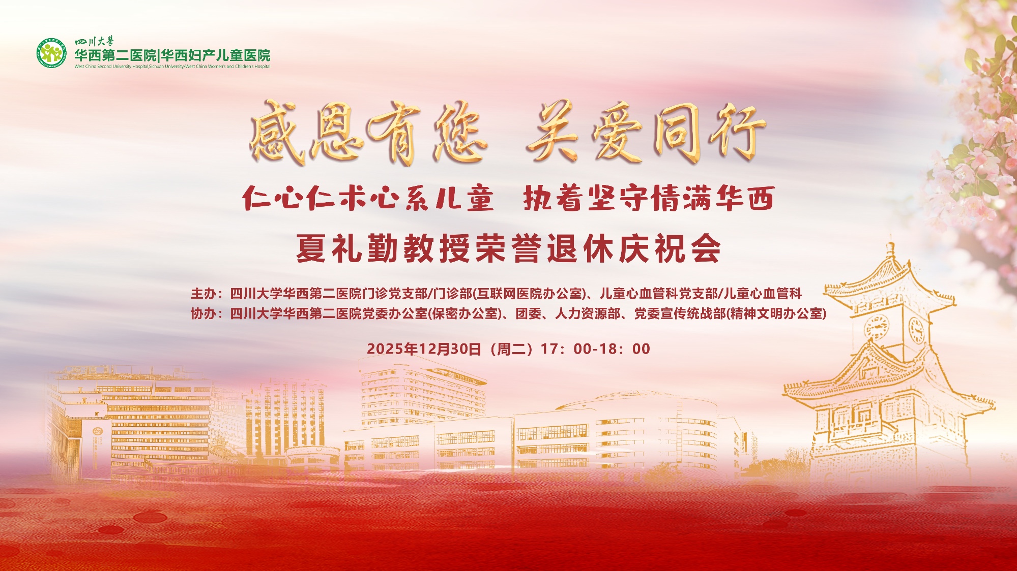 2025年12月30日,四川大学华西第二医院门诊党支部/门诊部与儿童心血管党支部/儿童心血管科联合举办“感恩有您 关爱同行”系列活动之“仁心仁术心系儿童,执着坚守情满华西——夏礼勤教授荣誉退休庆祝会”。医院领导、相关部门负责人、科室同仁齐聚一堂,共同向为医院奉献五十余载的...