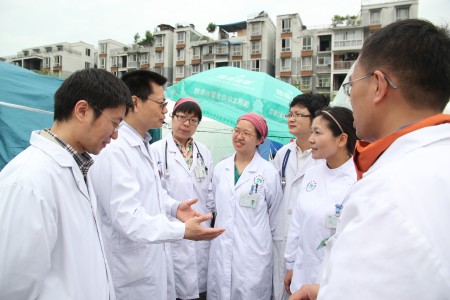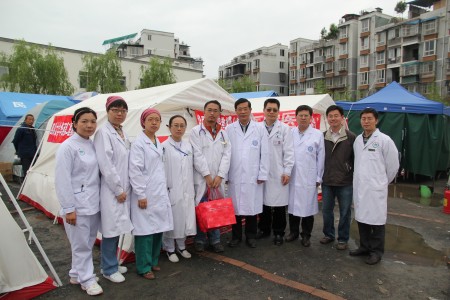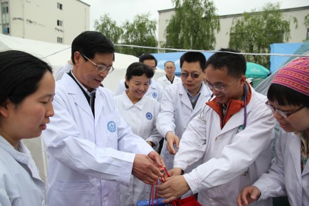 4月24日,四川大学党委书记杨泉明、党委副书记周学东、华西医学中心处长杨志刚,我院院长母得志、工会主席王晓东一行来到芦山县人民医院,慰问我院抗震救灾一线医疗队员。