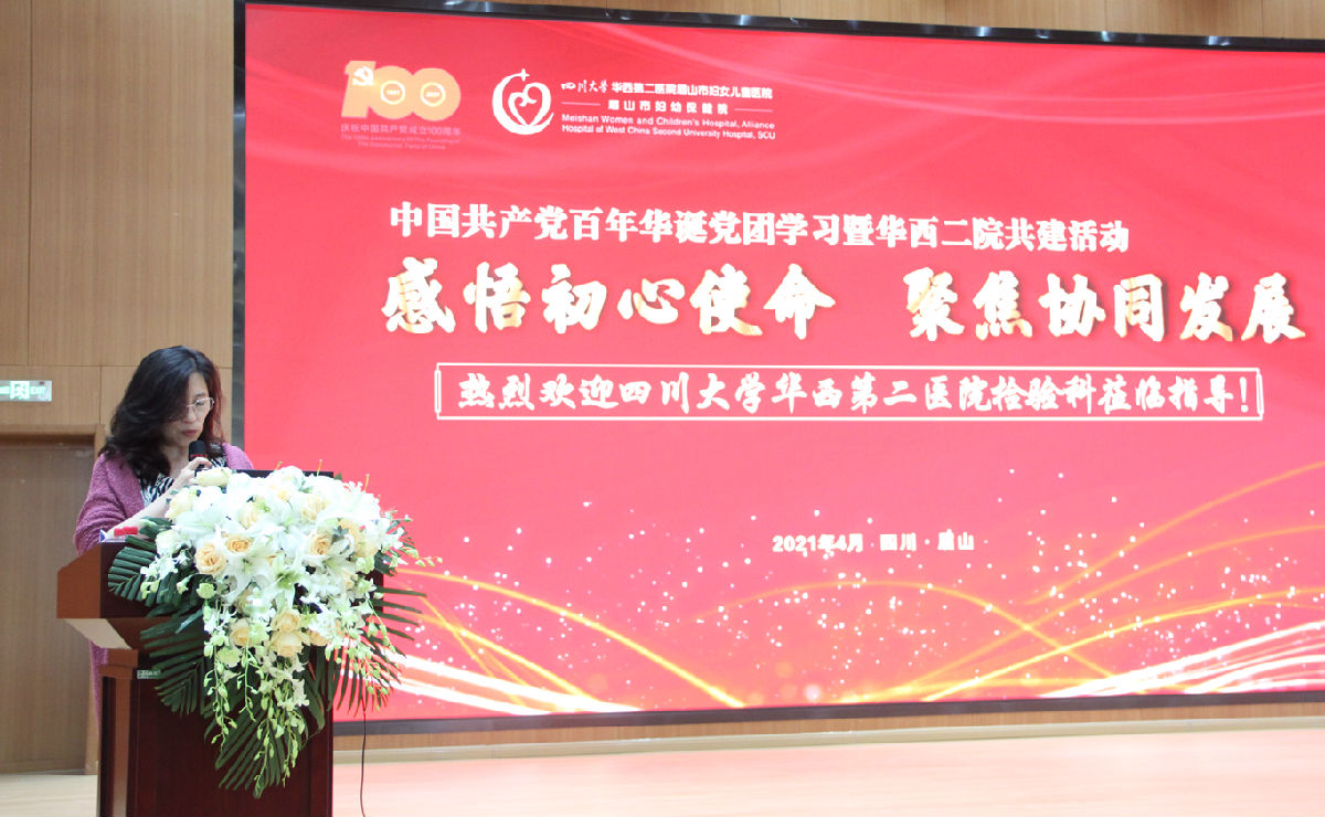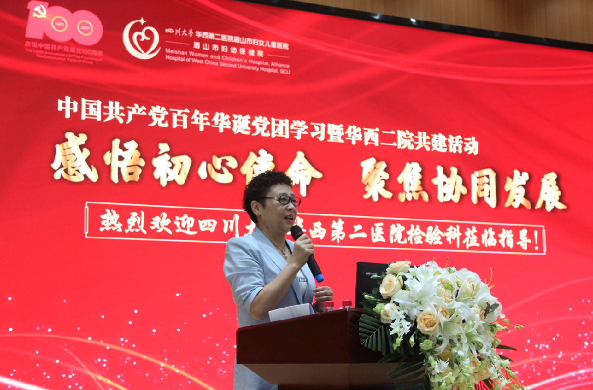 检验科主任江咏梅代表团队致辞。她感谢眉山市妇保院的邀请和支持,表示将在四川大学华西第二医院的统一部署和领导下,持续支持医联体建设,充分下沉优质管理理念和医疗资源,帮助眉山市妇保院检验科尽快通过ISO15189认可。