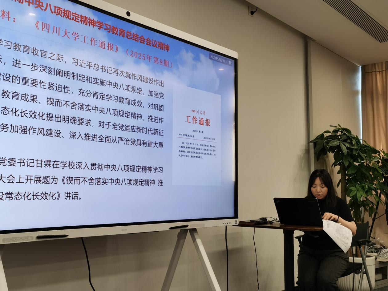 首先,支部书记崔陶向全体党员传达了学校深入贯彻中央八项规定精神学习教育总结会会议精神,带领大家深入学习了《四川大学华西第二医院贯彻落实中央八项规定精神及实施细则实施办法》的核心要义,并强调要深刻领会习近平总书记就作风建设作出的重要指示,锲而不舍落实中央八项规定精神,将其融入日常管理服务工作之中,持续改进工作作风、热情服务群众、厉行勤俭节约。随后,全体党员结合2025年党员基本培训第2次集中大课内容,开展了交流研讨,医务部瞿志强、病案管理部陈斯绮、护理部万兴丽、医院感染管理部罗瀛宇和随访中心唐欣欣做为党员代表分享了学习心得。大家一致认为,作为医疗机构的行政服务人员,必须牢固树立以人民为中心的发展思想,将“为人民服务”的宗旨内化于心、外化于行,不断提升管理效能和服务水平,为临床一线和患者提供更有温度、更高效能的支撑保障。在专题党课环节,随访中心许敏主任以“努力践行为人民服务精神——持续传递医疗的温度”为题,结合随访工作实际,分享了如何将党建学习成果转化为提升患者满意度、优化服务流程的具体实践。党课内容生动详实,引发了党员的广泛共鸣。