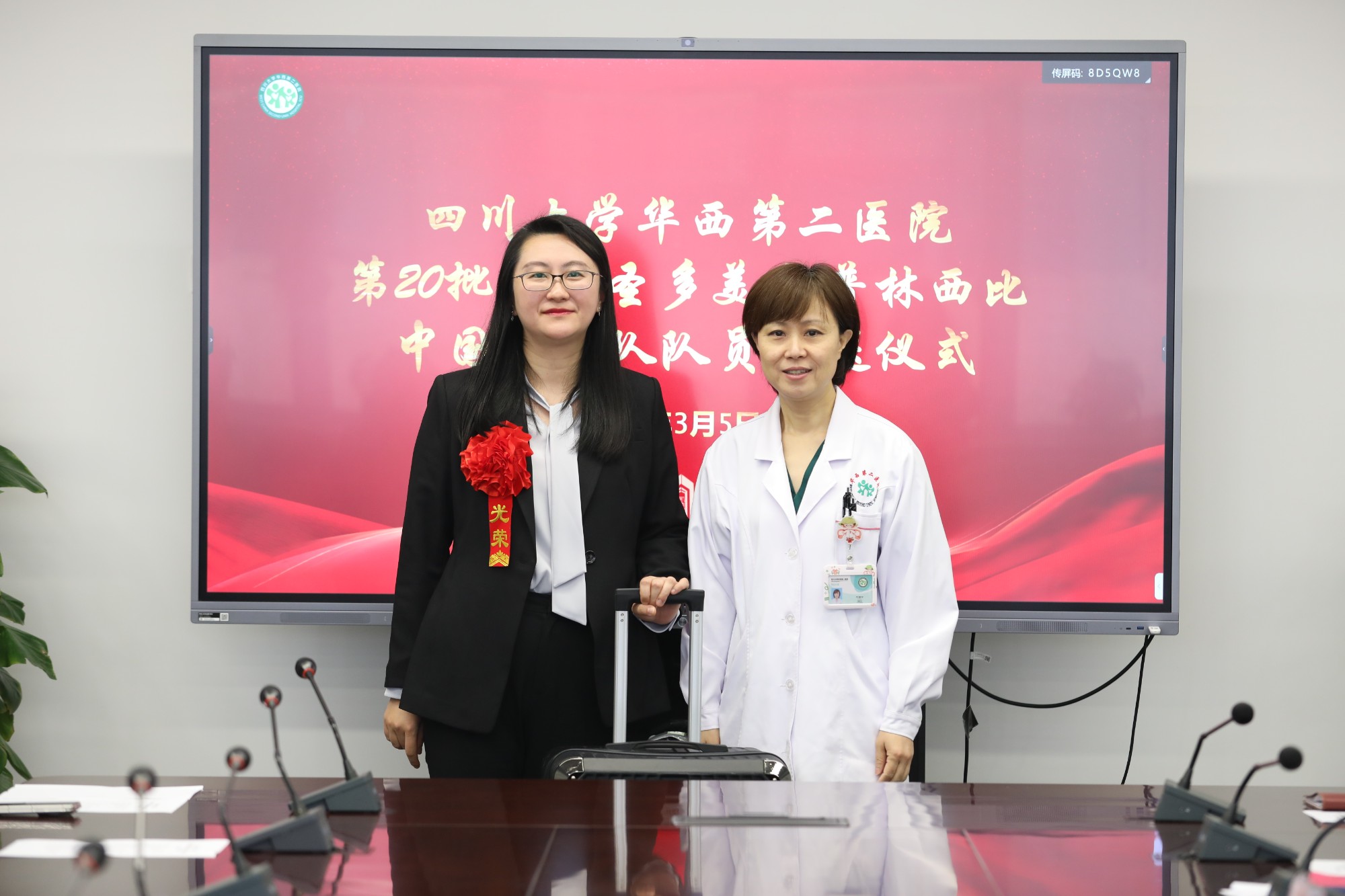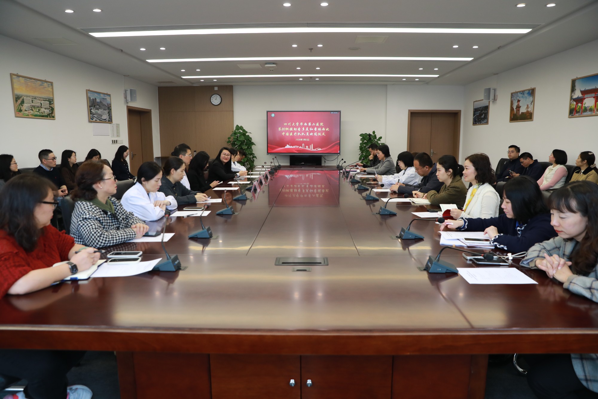 2026年3月5日上午,四川大学华西第二医院在锦江院区隆重举行第20批援圣多美和普林西比中国医疗队队员欢送仪式。院领导、相关职能部门负责人、临床科室代表及往届援外队员代表齐聚一堂,共同欢送即将远赴非洲执行国际医疗援助任务的傅璟医师。仪式由人力资源部刘葭部长主持。
