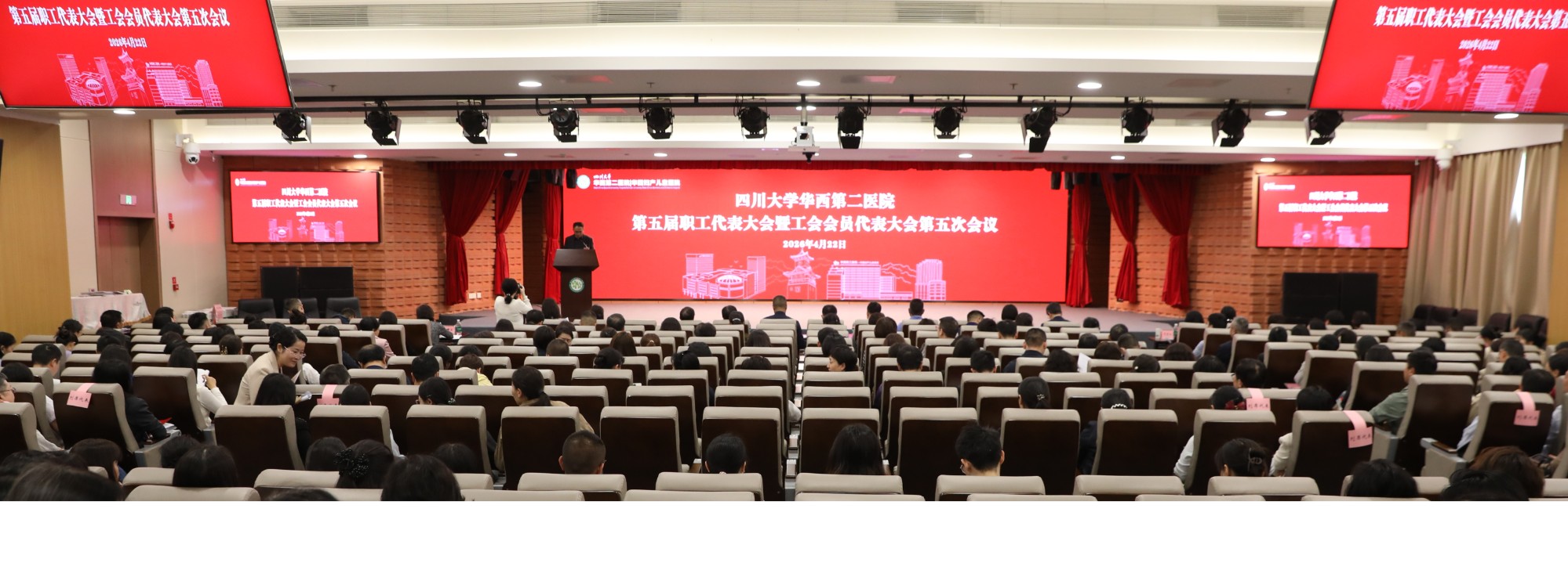2026年4月22日,四川大学华西第二医院第五届职工代表大会暨工会会员代表大会第五次会议在锦江院区后勤综合楼二楼多功能厅召开。本次会议的主题是:擘画“十五五”新蓝图,奋力谱写世界一流妇幼医学新篇章。医院党委书记黄勇、院长刘瀚旻等全体院领导,国家级高端人才代表、省级学术带头人代表、突出贡献专家代表、教授委员会委员代表、民主党派及无党派人士代表、各级人大代表和政协委员代表、退休职工代表、华西妇幼医学健康集团成员单位院领导,“双代会”正式代表、列席代表等参加会议。党委副书记、纪委书记陈大鹏主持会议。