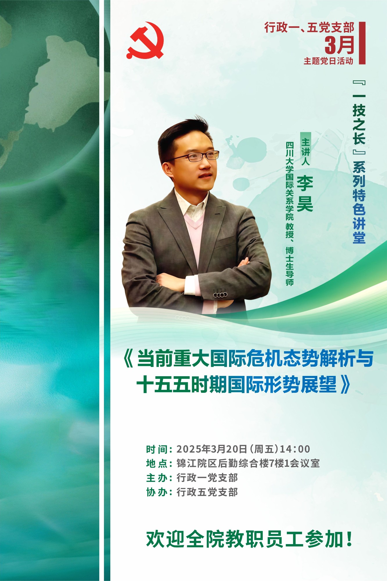 3月20日下午14:00,行政一、五党支部在锦江院区后勤综合楼7楼1会议室举办了主题党日活动——“一技之长”系列特色讲堂之《当前重大国际危机态势解析与十五五时期国际形势展望》。活动邀请四川大学国际关系学院教授、博士生导师李昊主讲,全院各支部党员踊跃参与,现场学习氛围热烈。本次讲课由支部书记陈静同志主持。
